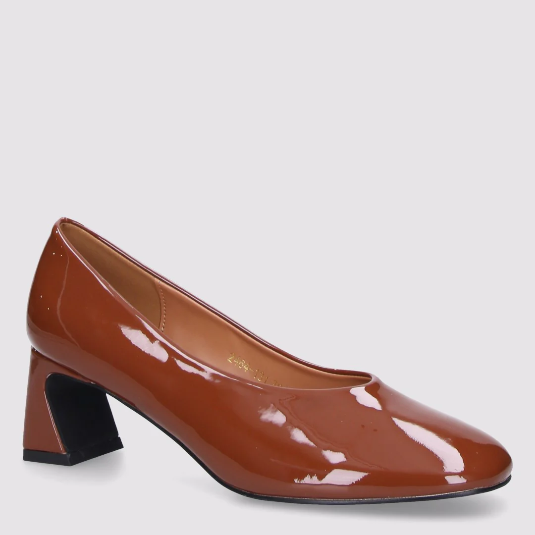 Décolleté in pelle verniciata. Punta ovale, scollatura a U, tacco lucido scultoreo. Particolare e super glamour