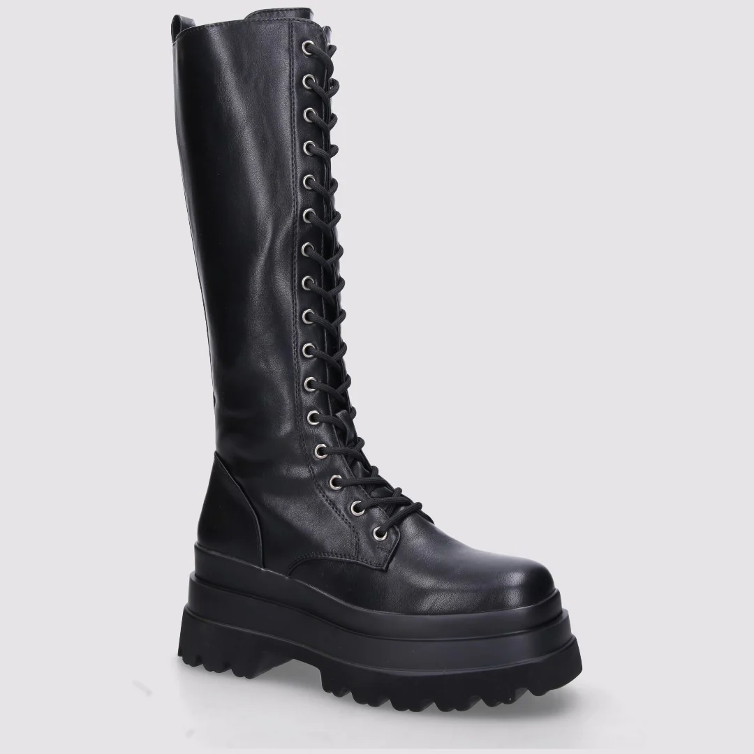Stivale modello anfibio in pelle nera con zip interna e chiusura frontale con lacci estetici. Modello iconico, con cuciture tono su tono, plateau alto e suola boldata. Evergreen sempre di tendenza, la scarpa alla quale non puoi rinunciare!