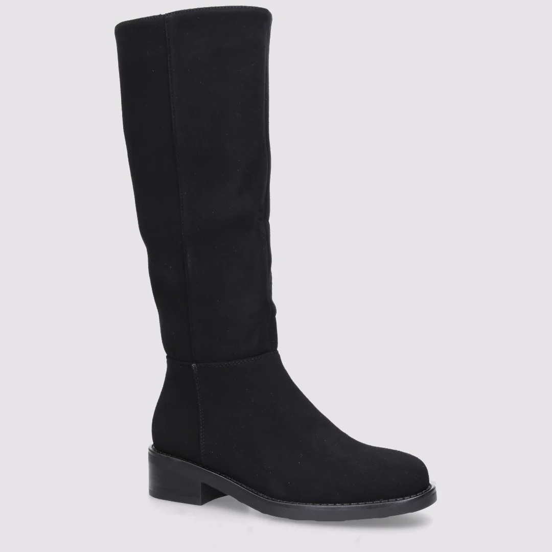 Stivale in camoscio. Suola piatta, chiusura con zip interna, tacco largo, punta tonda. Design semplice e classico, adatto alle amanti dei look basic