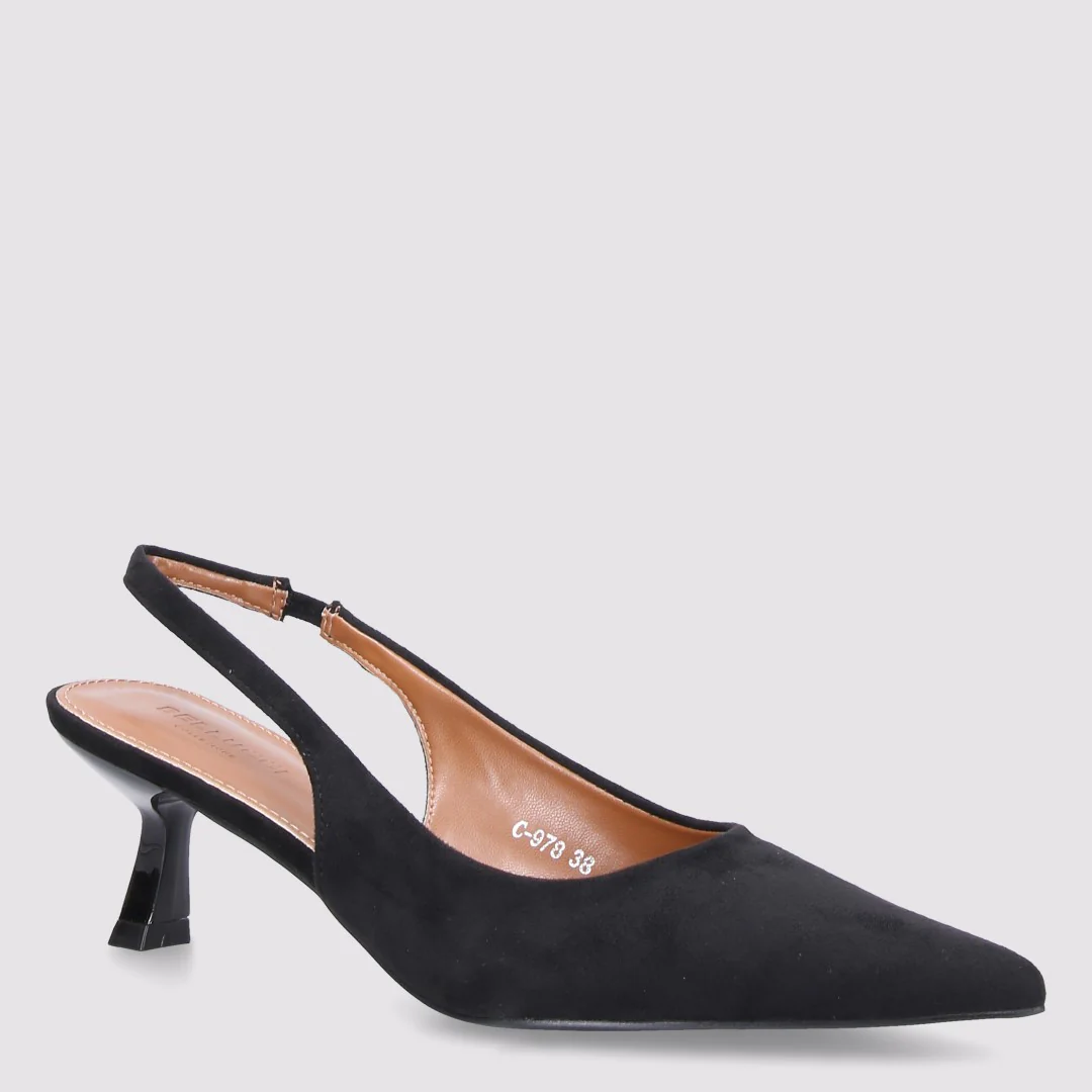 Décolleté sling back a punta in camoscio. Tacco lucido kitten heel, scollatura leggermente squadrata, talloncino tondo. Per un look basic e femminile, sempre attuale!
