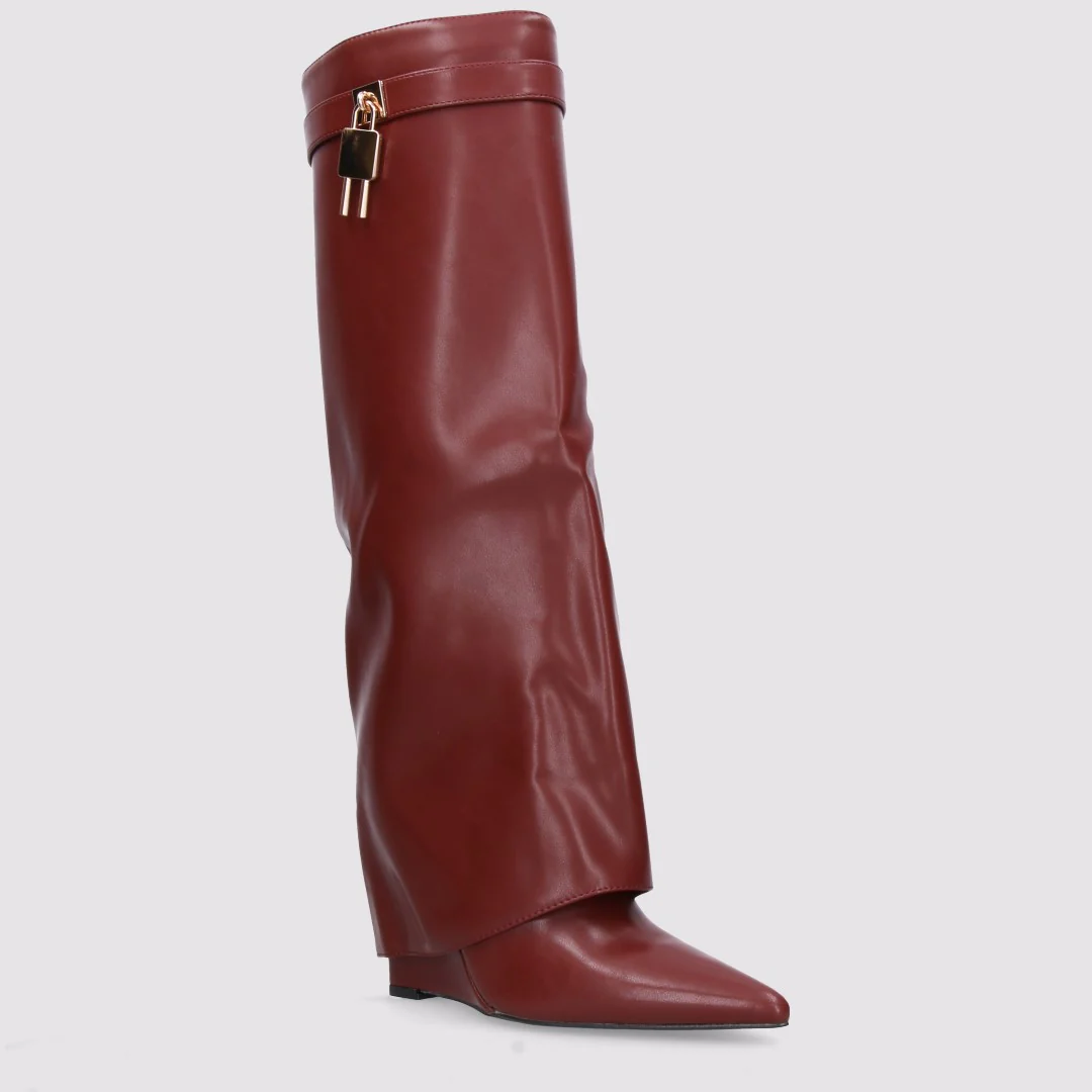 Stivale in pelle con catenaccio in metallo oro. Punta affusolata, gambale con risvolto, spacco laterale. La zeppa comoda lo rende perfetto per essere indossato tutta la sera, anche in discoteca a ballare all night long