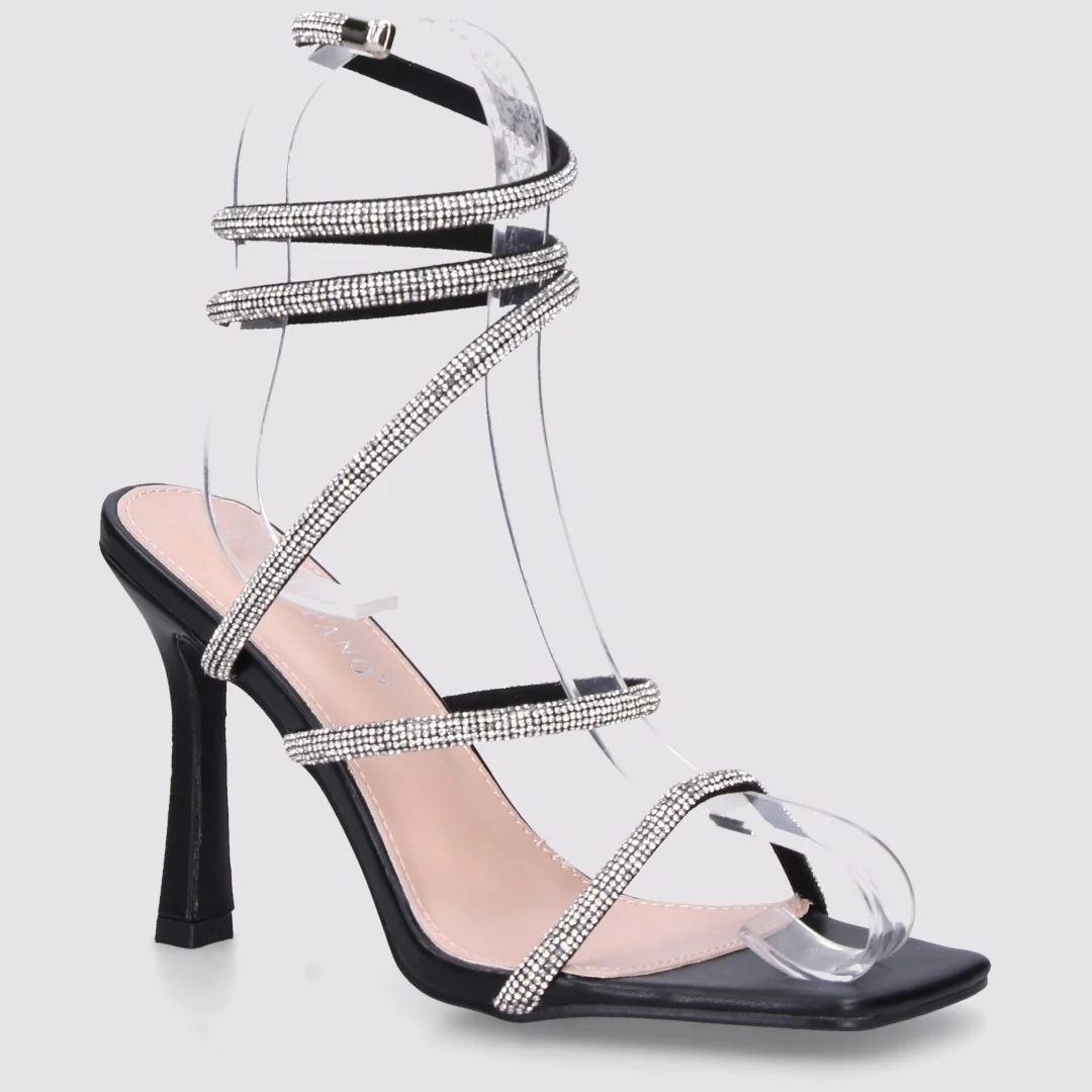 Sandalo gioiello in pelle. Punta quadrata, laccio alla caviglia con struttura rigida con fil di ferro, strass applicati all over, fasce tubolari. La semplicitĂ nella struttura e negli abbinamenti, lo renderanno il tuo sandalo estivo preferito! Pratico di tendenza, che rende i tuoi look sexy con un semplice tocco.Â