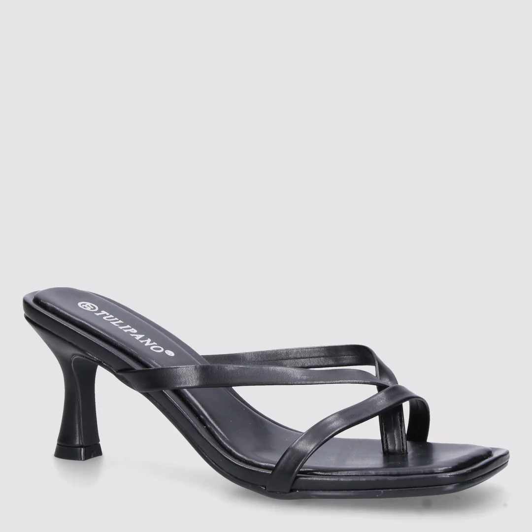Sandalo a sabot in pelle. Tallone scoperto, tacco a rocchetto, design a infradito con fascia, punta quadrata. Comodo e versatile, di ispirazione anni 2000