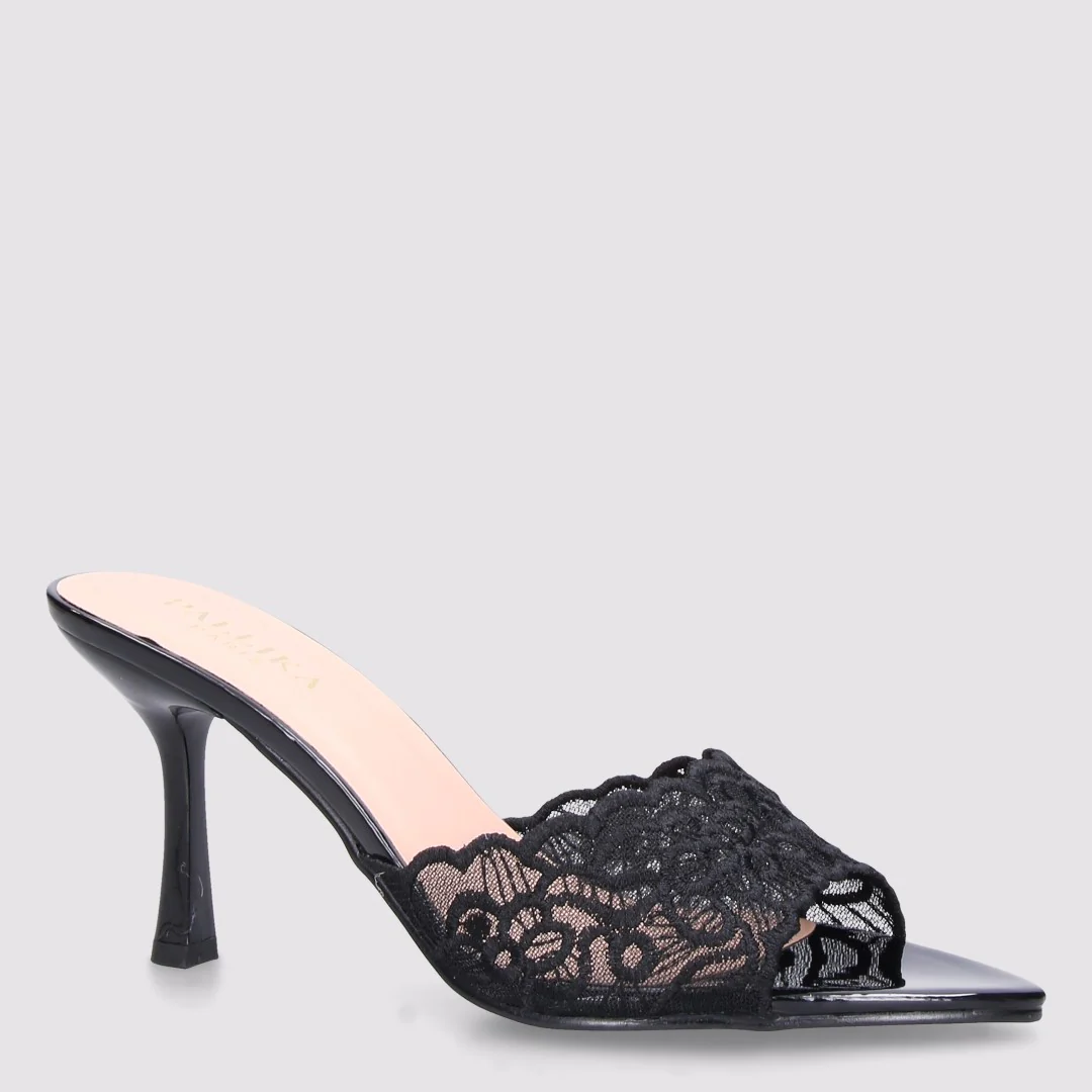 Sandalo a sabot in pelle verniciata. Tallone scoperto, tacco lucido, fascia singolaĀ in pizzo con ricami effetto vedo non vedo, punta affusolata. So chic!
