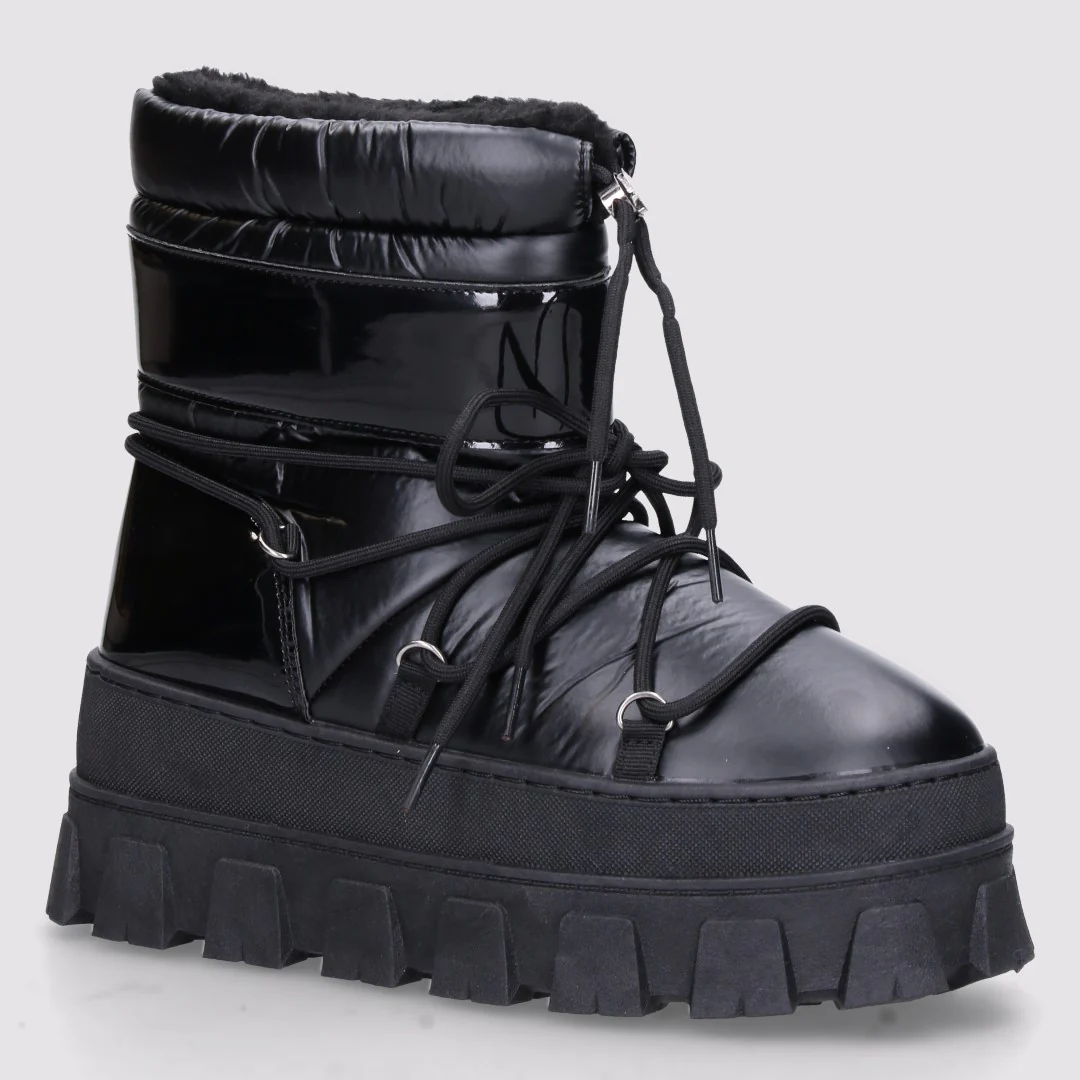 Stivaletto da neve modello doposci in tessuto antipioggia. Inserti in pelle verniciata, chiusura frontale con lacci estetici, gambale regolabile con coulisse, interno in pelo. Comodissimi e super caldi